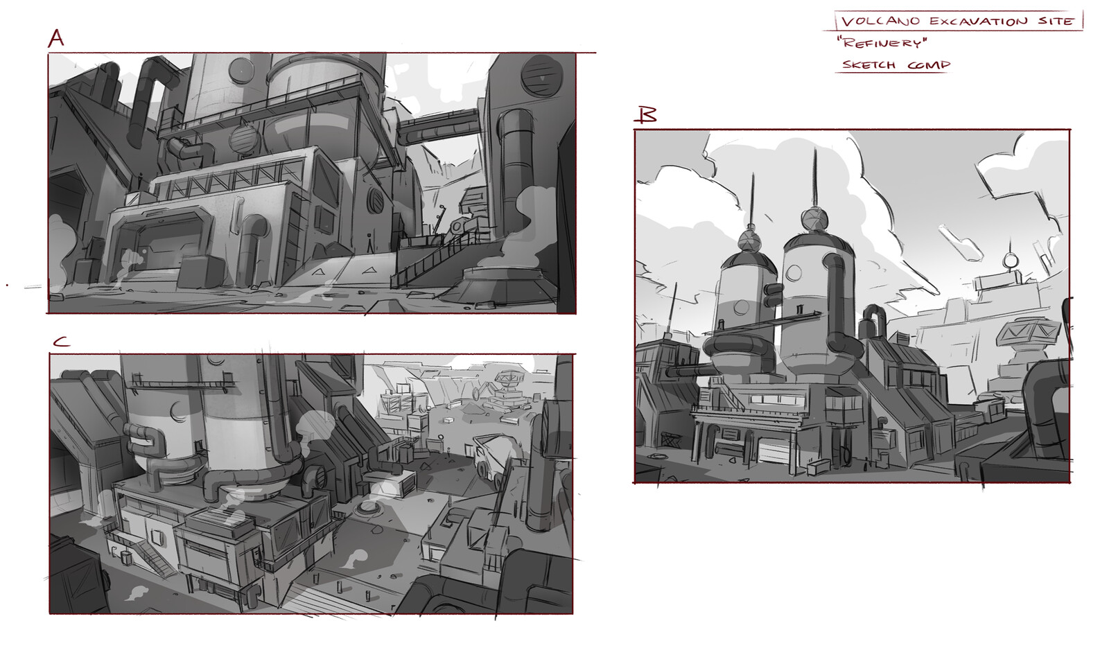 Environment art of a volcanic refinery that is excavating a special mineral found at the top of a volcano.
